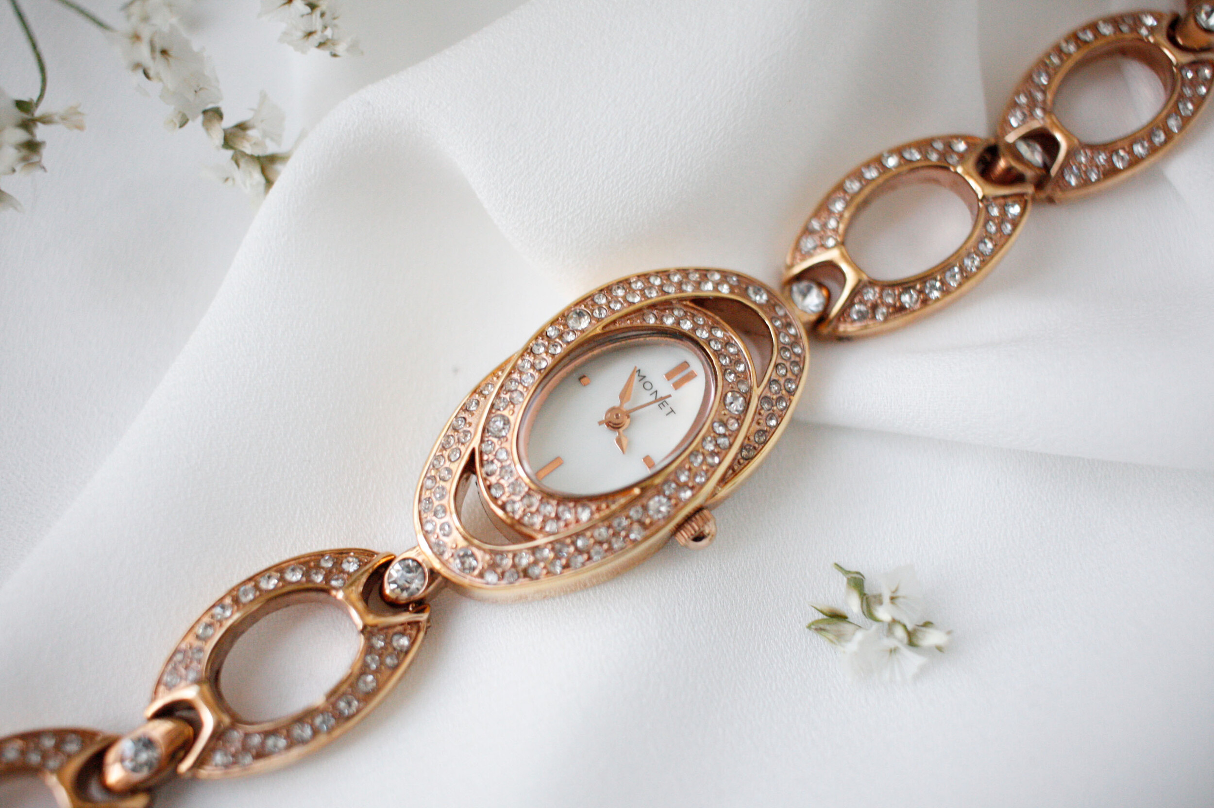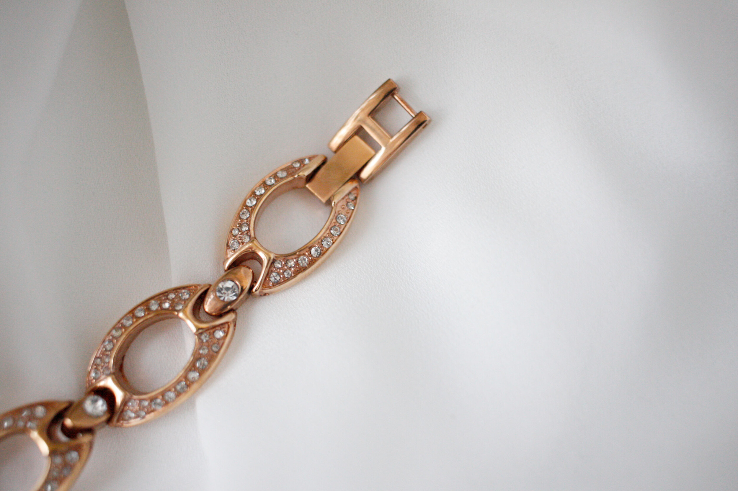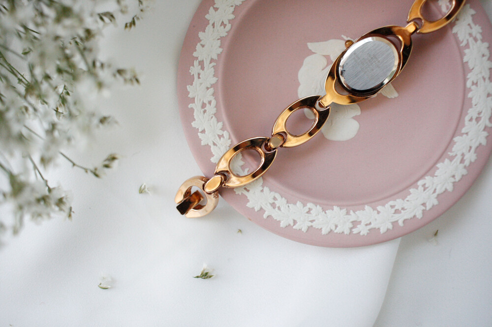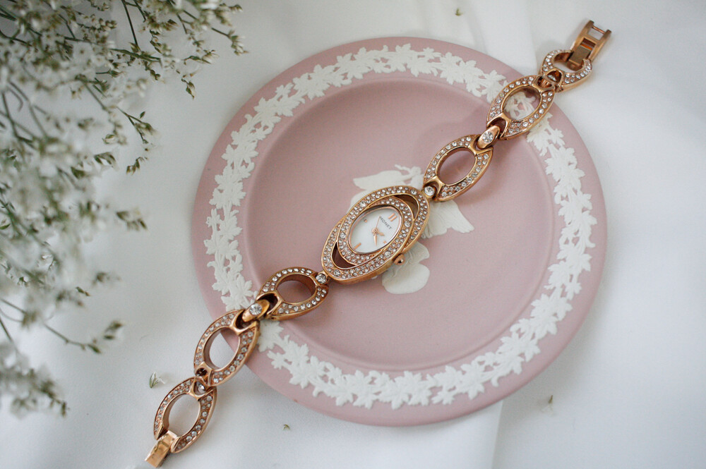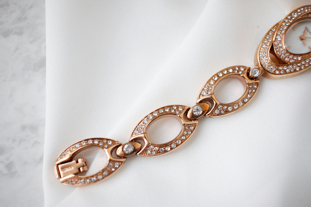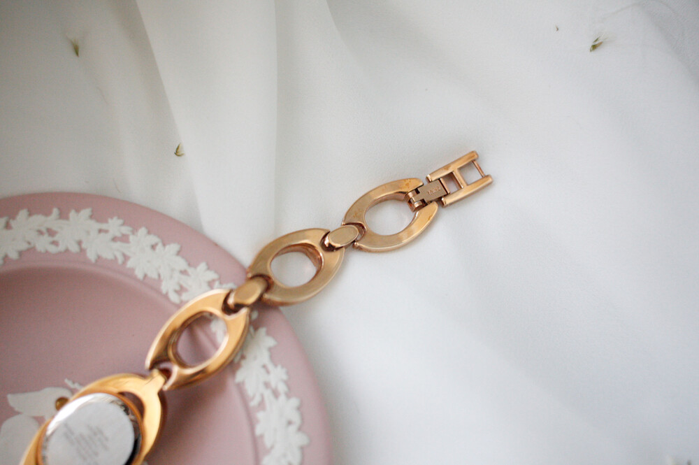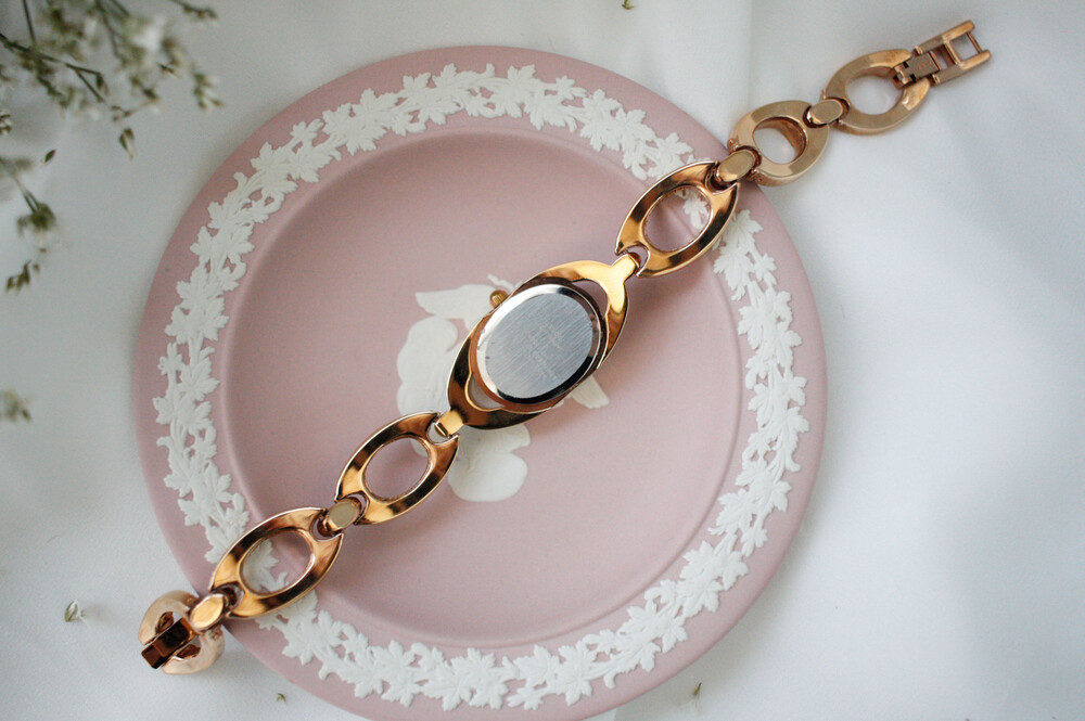 로즈골드 색상의 오벌 모양 베젤과 체인으로 이루어진 시계입니다. 착용 시 정말 예쁜 제품이구요, 빈티지 시계 중 보기 드분 로즈골드 컬러입니다. 베젤과 체인은 라인스톤으로 장식되어 있어 화려하고 고급스러운 제품입니다.