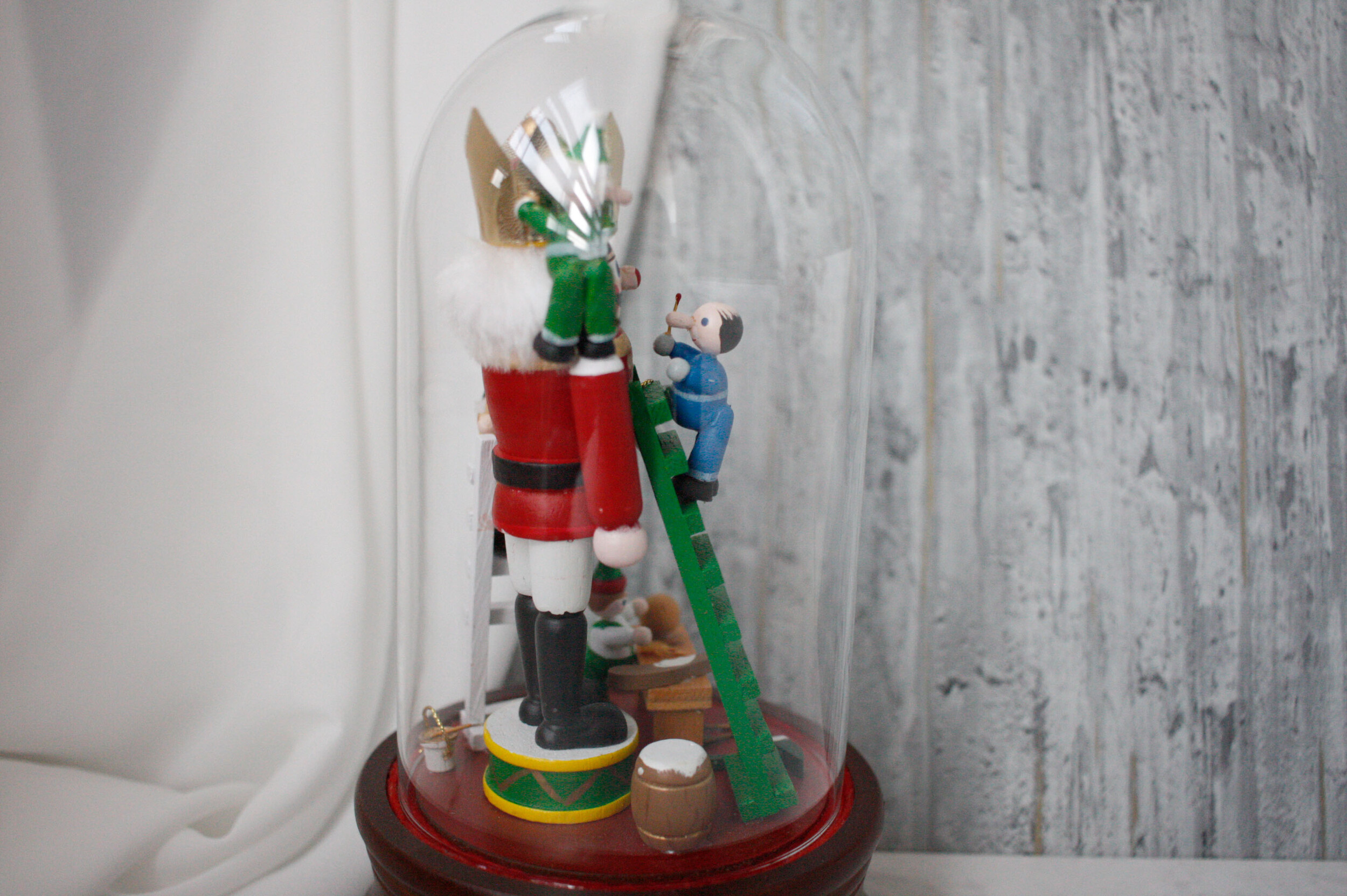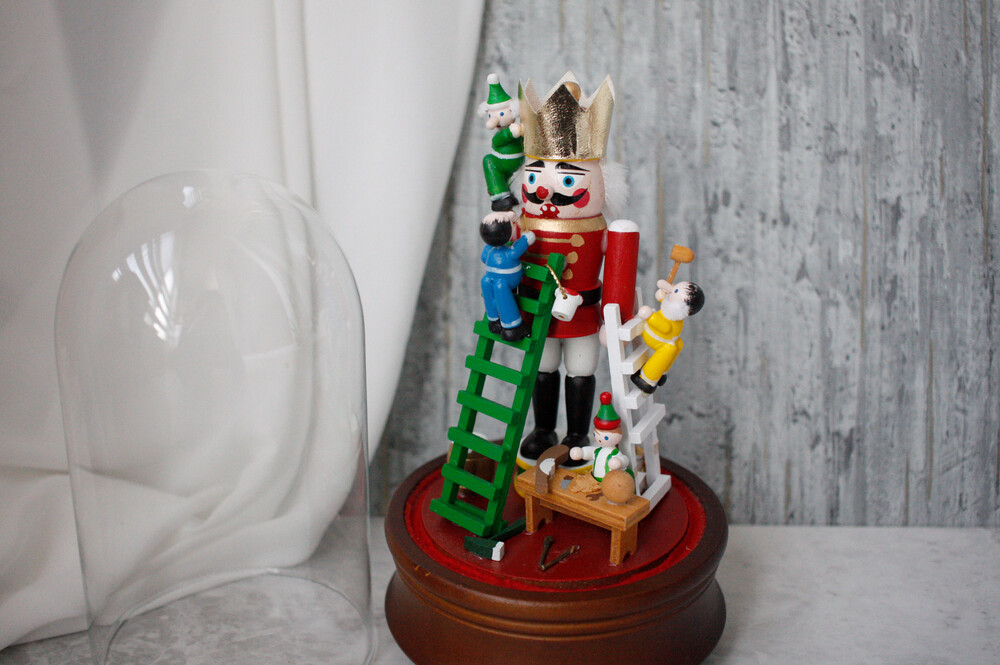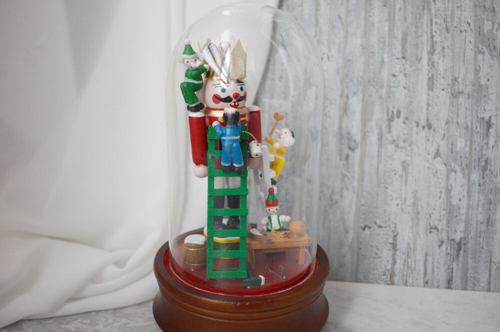 호두까기 인형을 제작하는 모양의 빈티지 뮤직박스입니다. 난쟁이가 사다리를 타고 올라가 나무 인형을 만드는 모습이에요. 돔유리가 뮤직박스를 덮고있는 모양이에요. 유리에는 아마 제작 당시부터 있었던 것으로 보이는 홈(?)이 몇 군데 있는데, 뒷부분이라 정면에서 보이지는 않아요. 빈티지이지만 뮤직도 잘 흘러나오는 제품입니다 :)