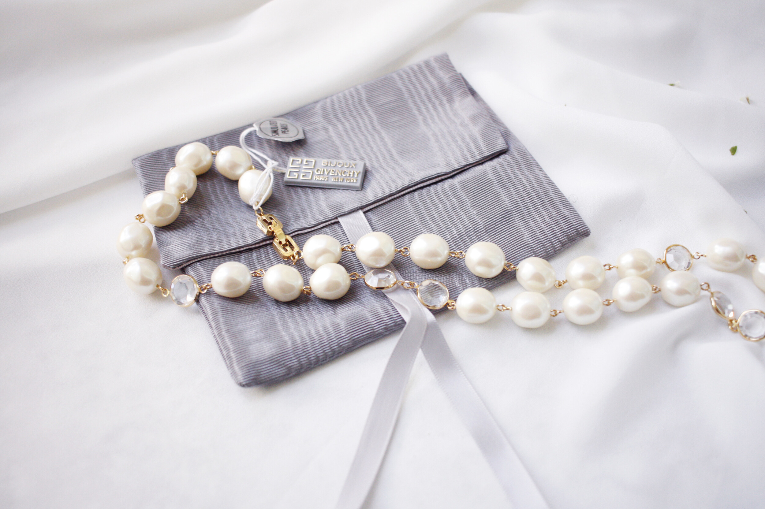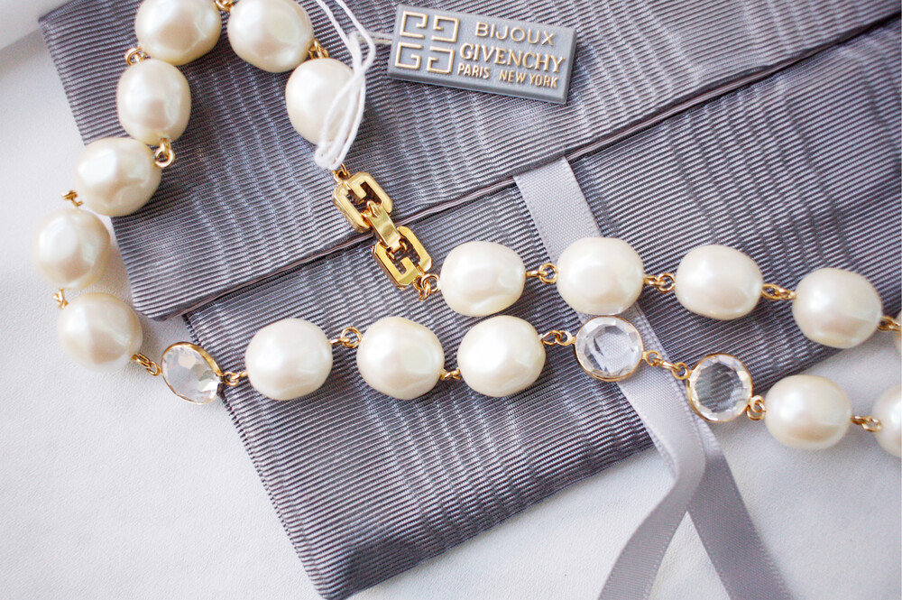 뉴올드스탁으로 보관되었던 지방시의 모조 바로크 진주 목걸이입니다. 중간 중간 스와로브스키 알이 들어가서 단조로움을 피해줬구요, 클래습 부분도 지방시의 시그니처 'G'가 사용되었습니다. 심플한 블랙드레스에 깔끔하게 걸쳐주어도 멋질, 소장가치 높은 디자인입니다. 오리지널 택과 오리지널 파우치까지 함께 배송됩니다 :)
