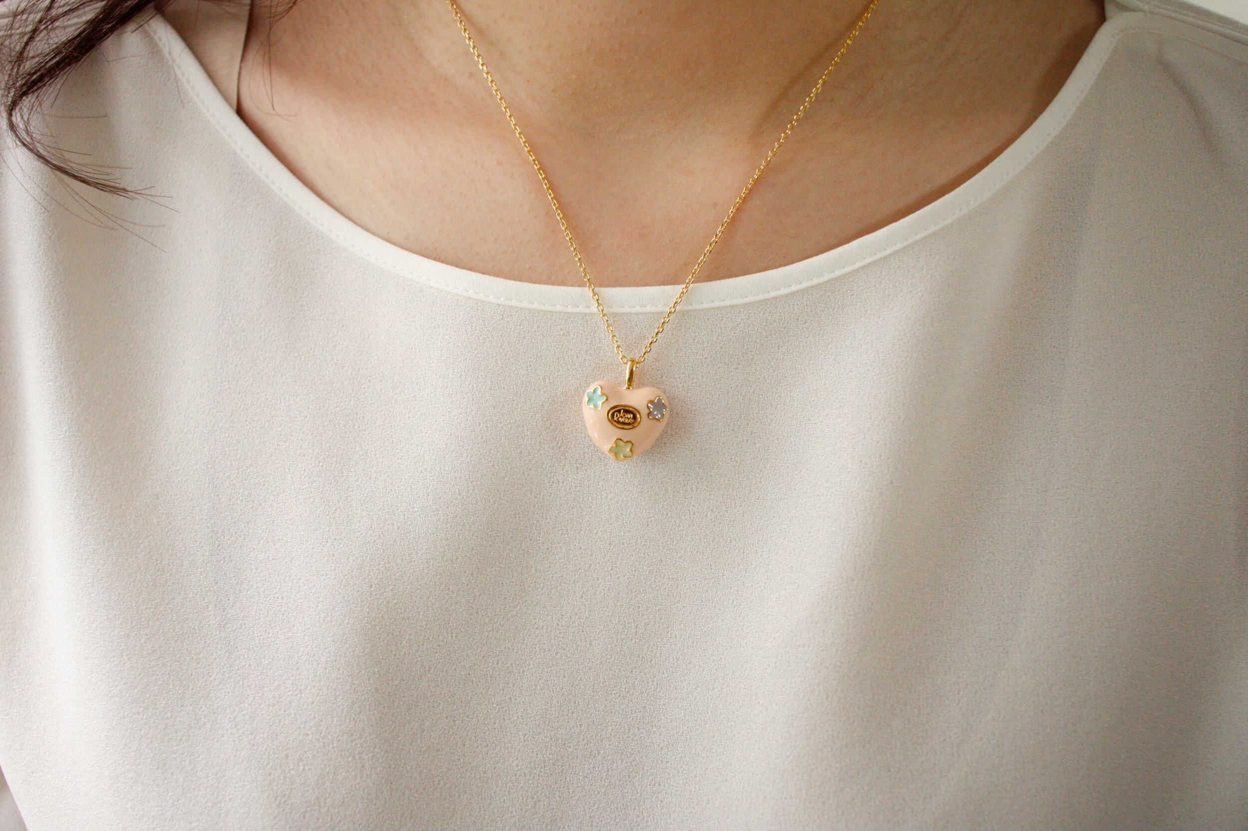 사랑스러운 핑크 하트 펜던트에 파스텔톤 데이지가 그려져 있어요. 925 실버 + 도금 체인과 함께 매칭하여 데일리로 착용하시기 좋은 제품입니다. 포인트가 되면서도 흔히 찾아보기 힘든 것이 바로 빈티지의 매력이죠. 전면엔 Joan Rivers 라고 각인이 되어있고, 뒷부분엔 각인이 없는 제품이라 앞 뒤 바꿔 착용도 가능한 제품입니다.