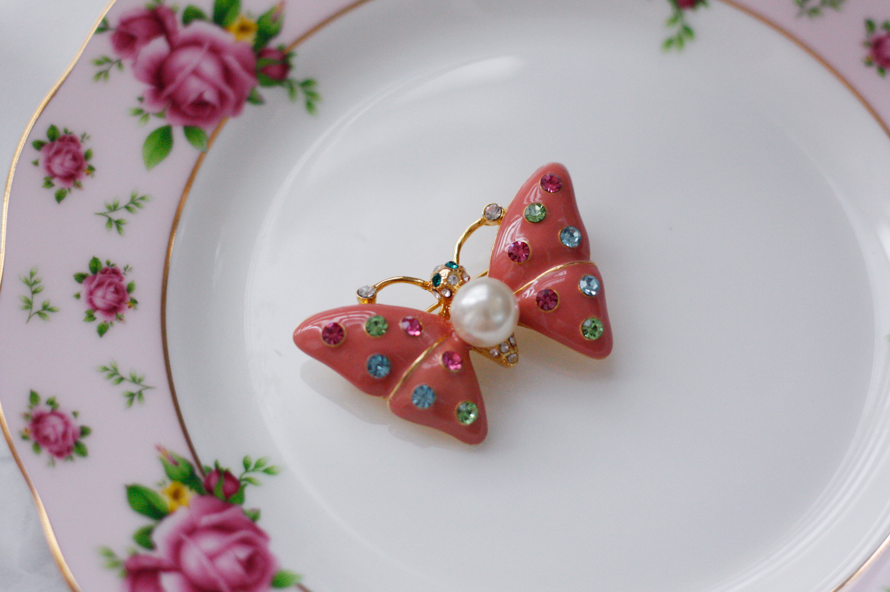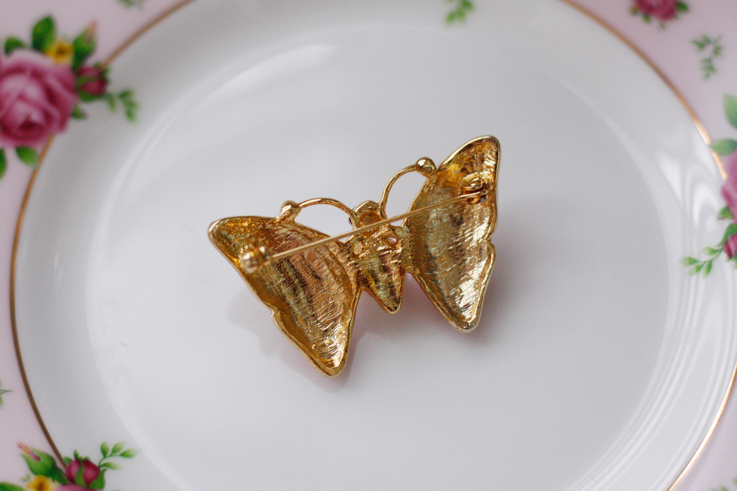 실제로 보시면 정말 고급스러운 나비 브로치입니다. 제가 제일 아끼는 동물 브로치 중 하나에요. 핑크핏도 매우 영롱하고, 라인스톤과 모조진주도 빛을 잃지 않은 아주 훌륭한 컨디션의 제품입니다. 나비의 더듬이, 눈, 몸통, 그리고 날개에 라인스톤이 박혀있구요, 후면 역시 반짝이는 골드빛을 그대로 유지하고 있습니다.