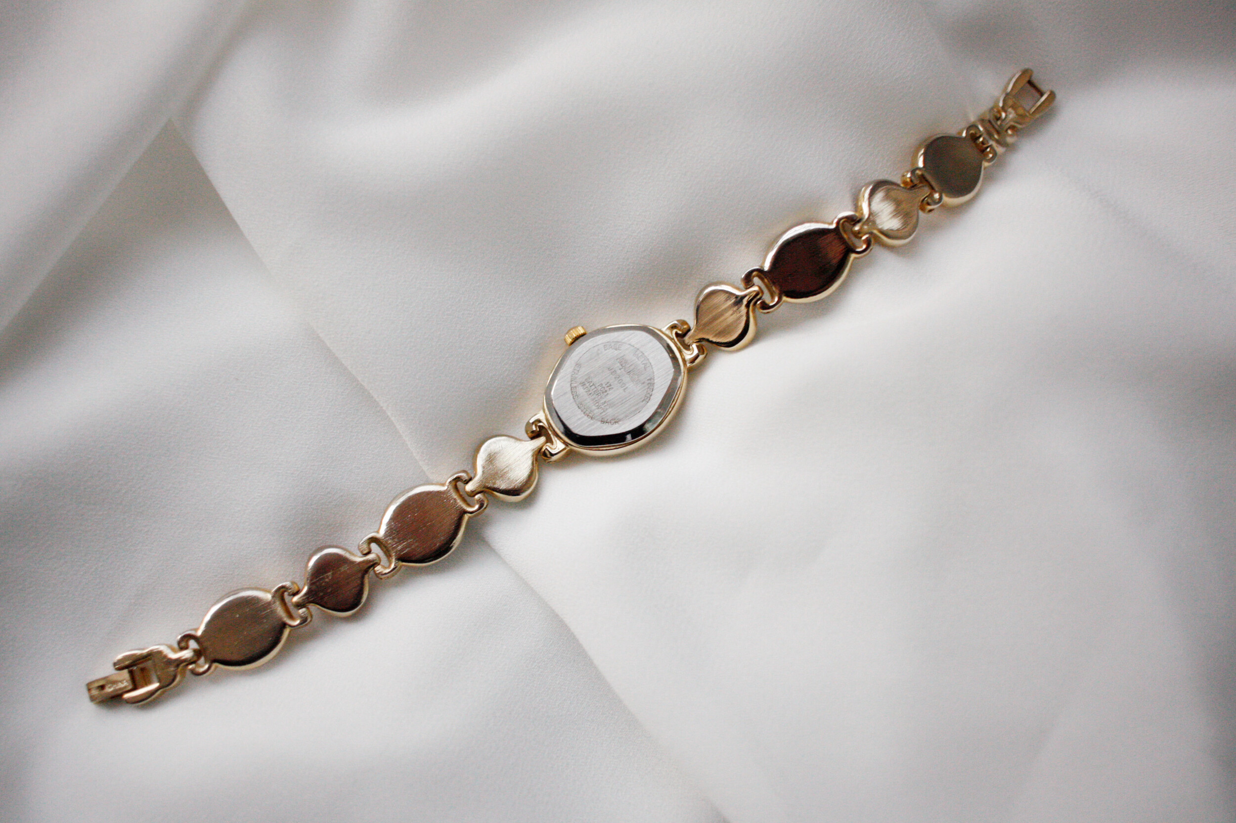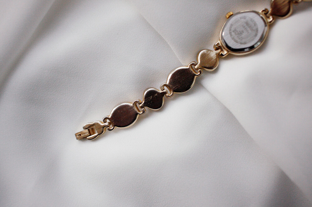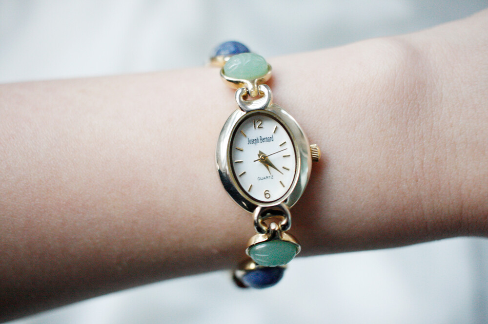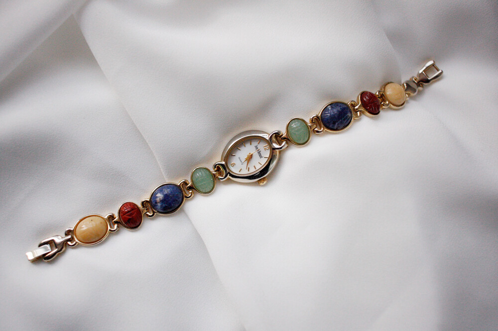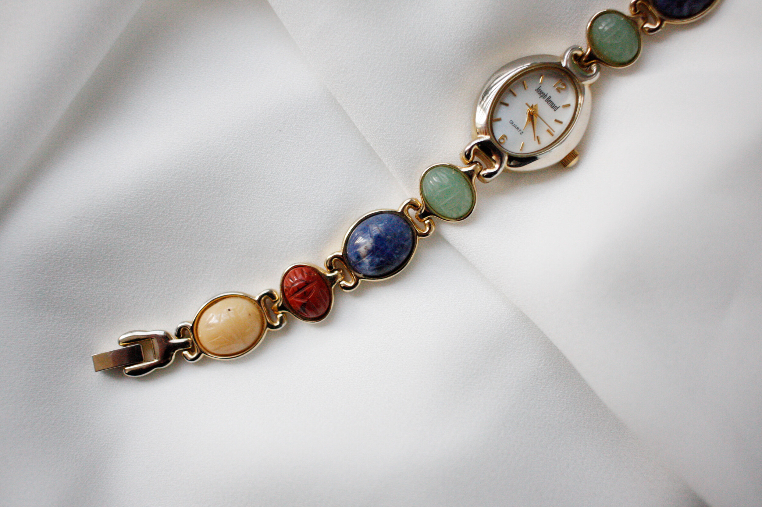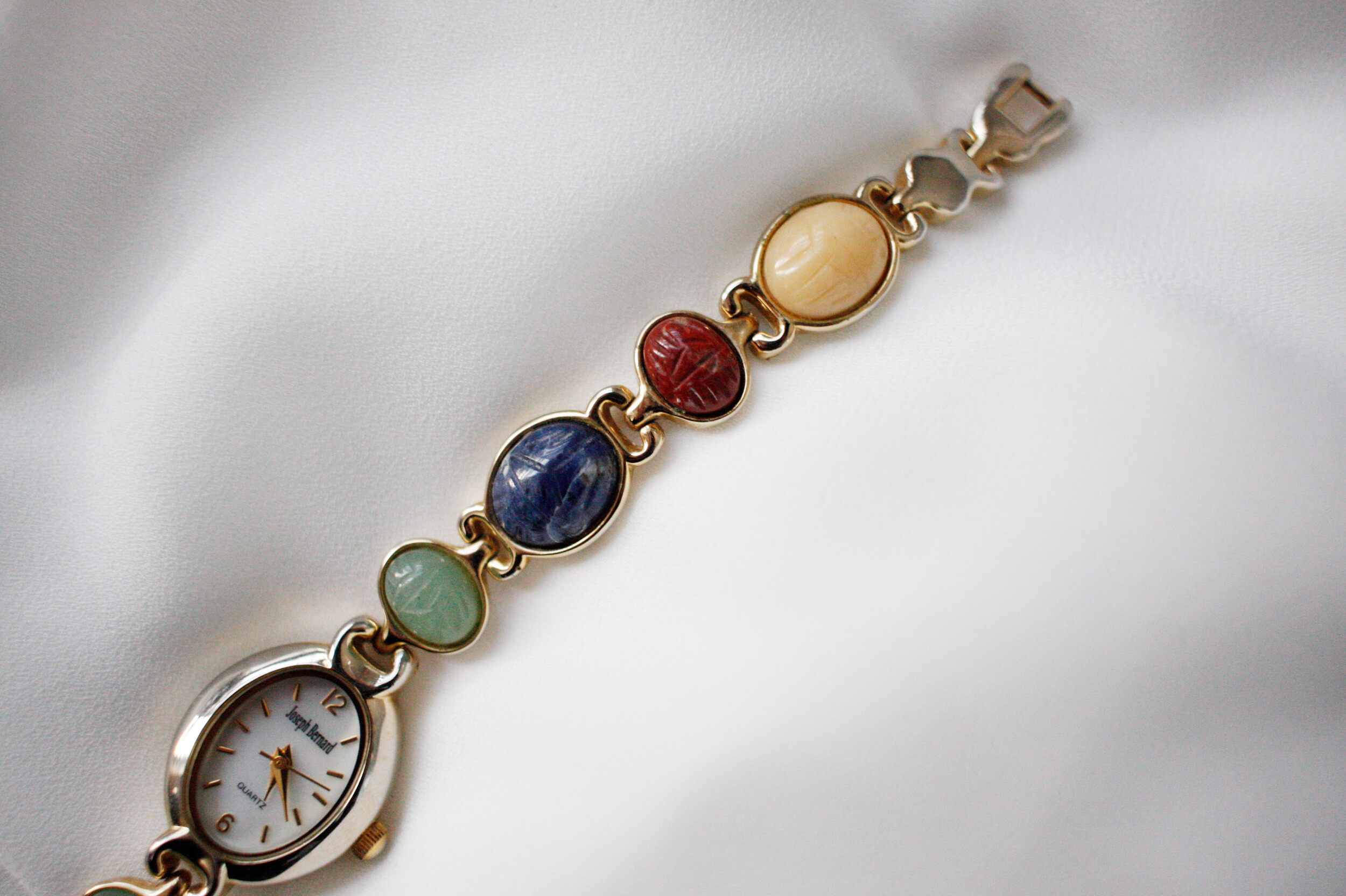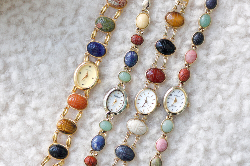 Joseph Bernard의 연한 골드톤의 Scarab 시계입니다. 조금 특이한 점은 스톤 모양이 일정하지 않고 가로 세로 엇갈려 들어가있는 점이에요. 톤 다운되어 있으면서도 약간의 마블이 섞여있는 제품으로 아주 매력적이랍니다. 스톤을 빼지 않고 1cm 가량 조절할 수 있는 체인이 한 칸 있어요 :)
