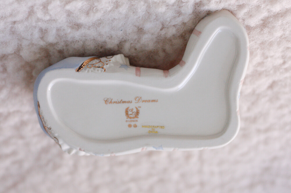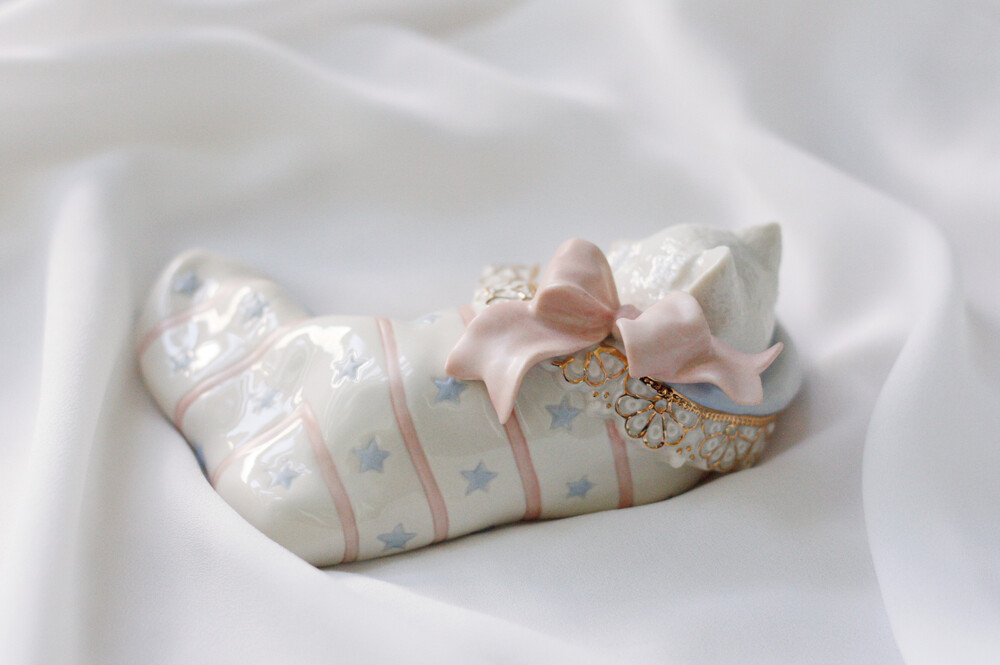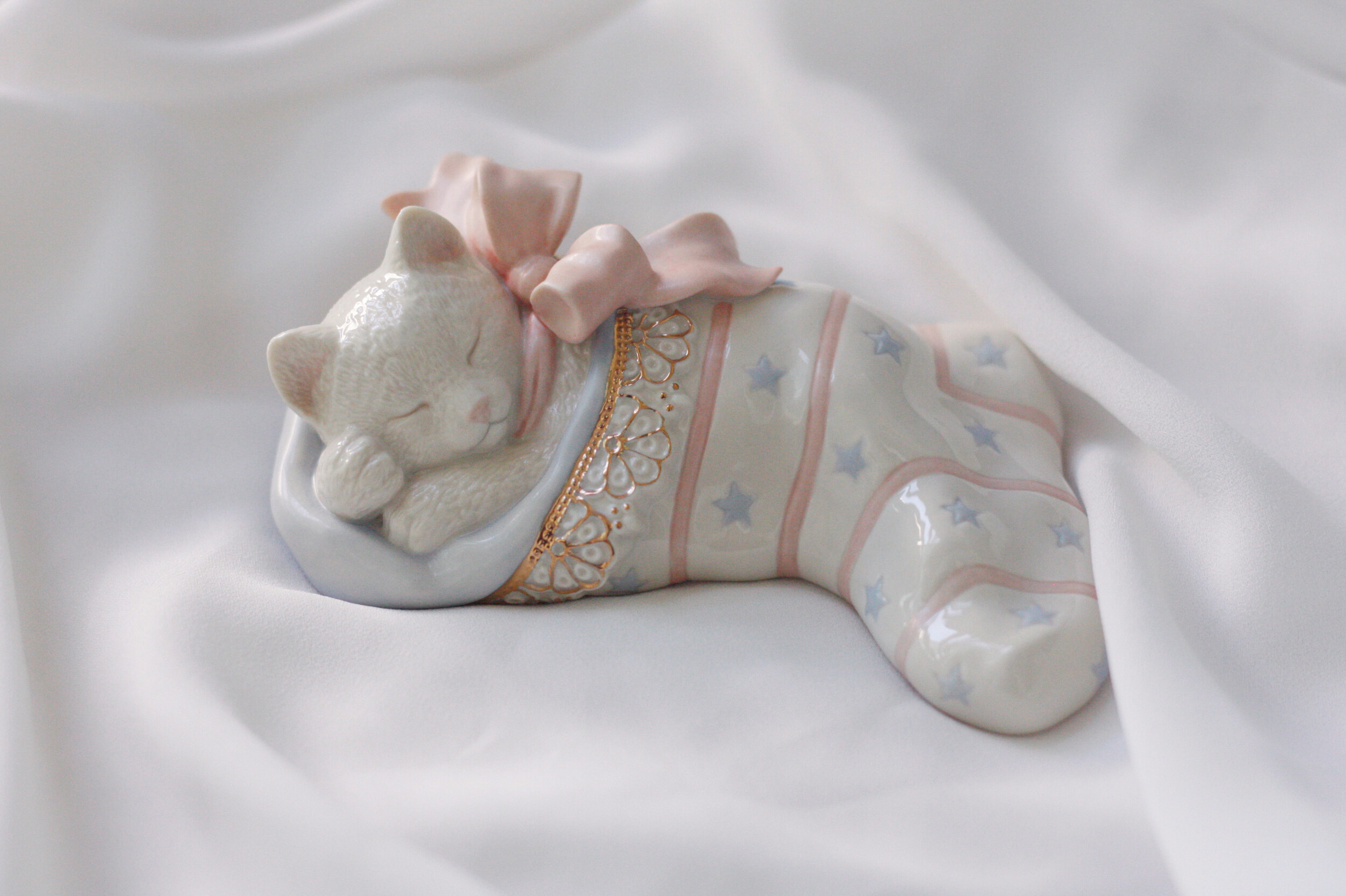 핑크 리본을 목에 달고 크리스마스 양말 속에 잠든 아기고양이 포슬린 피규린입니다. 화이트 & 핑크톤으로 사랑스러운 느낌이어요. 오리지널 박스에 보관된 뉴올드스탁 제품이랍니다 :)