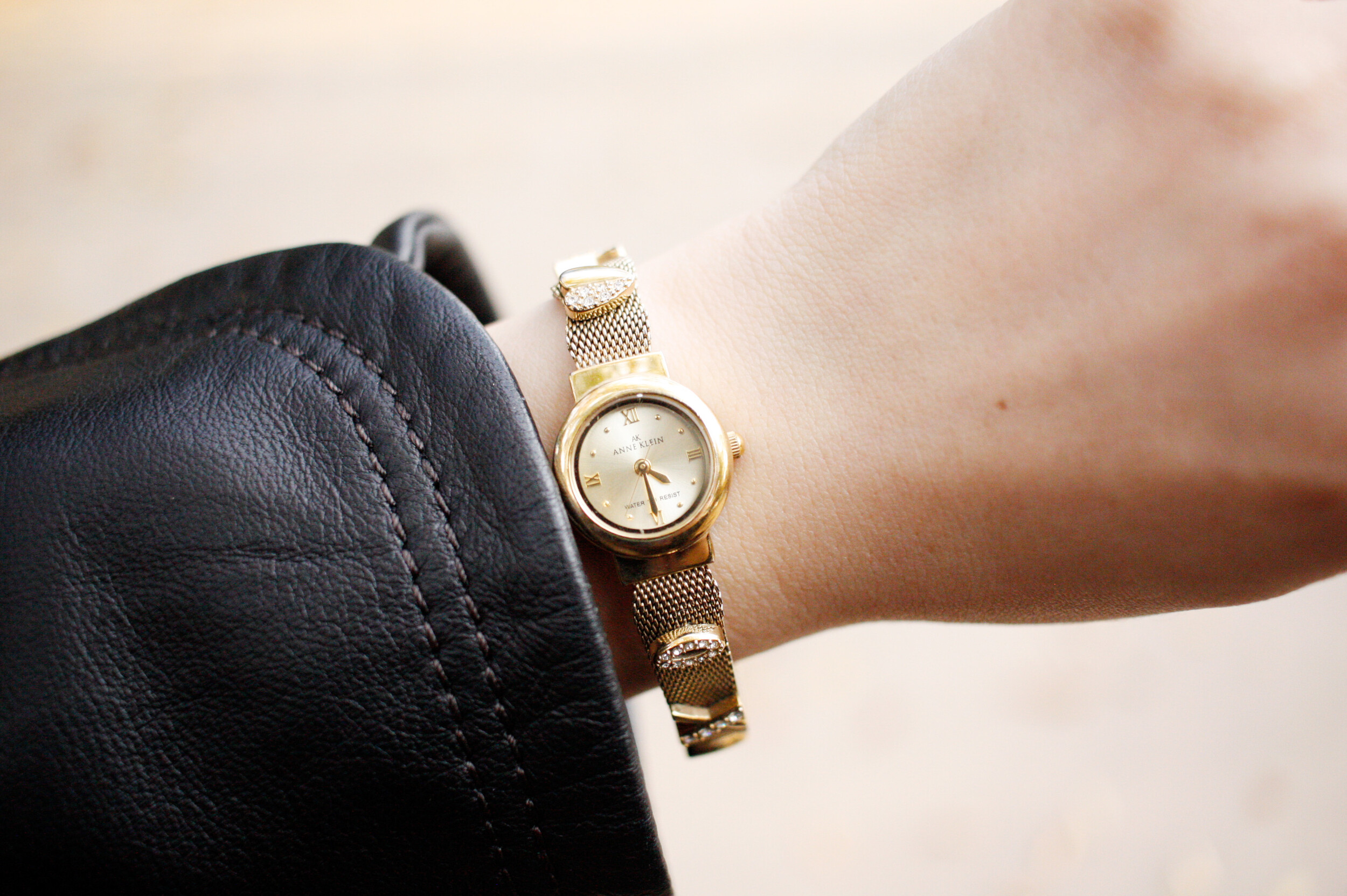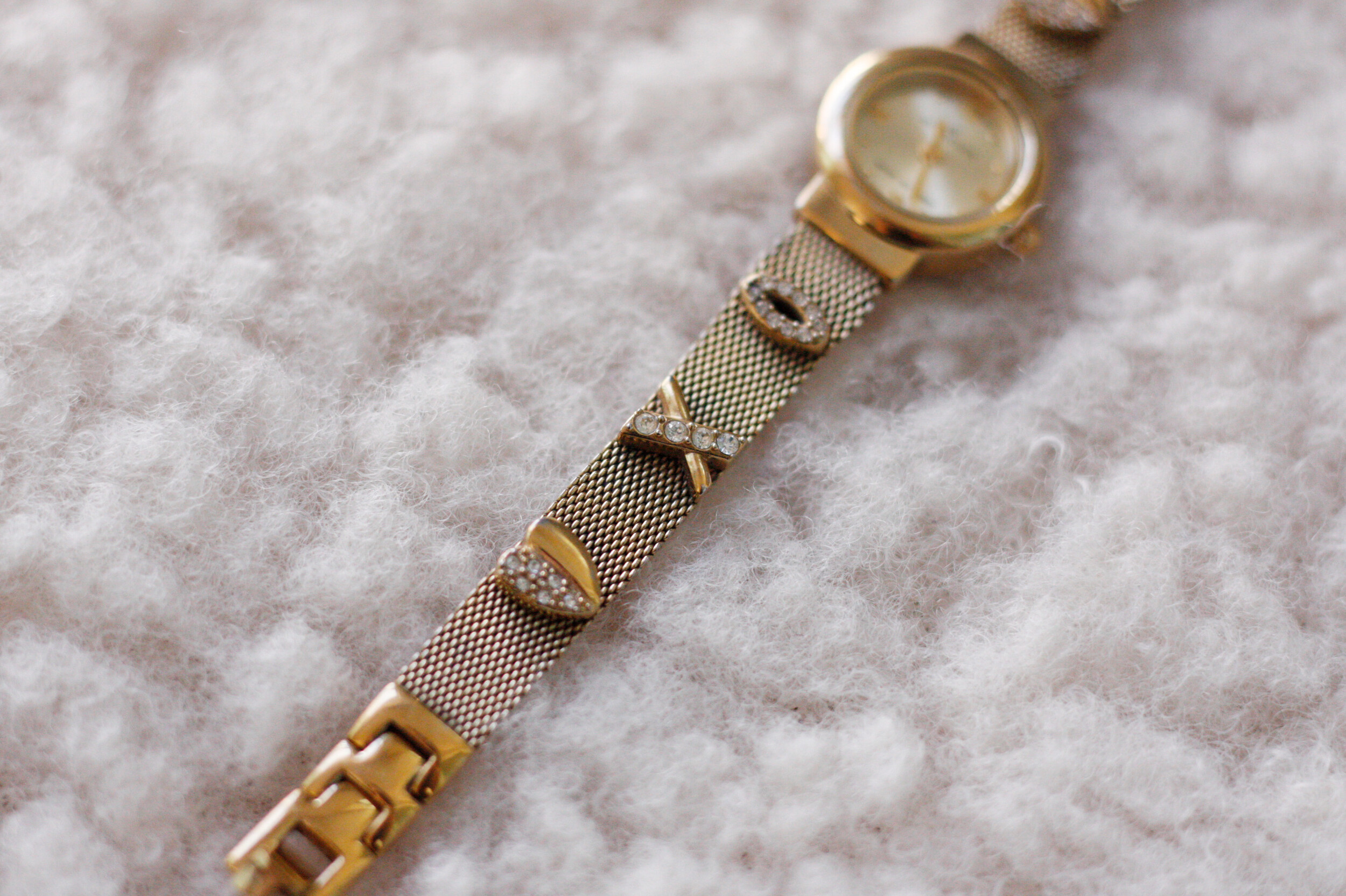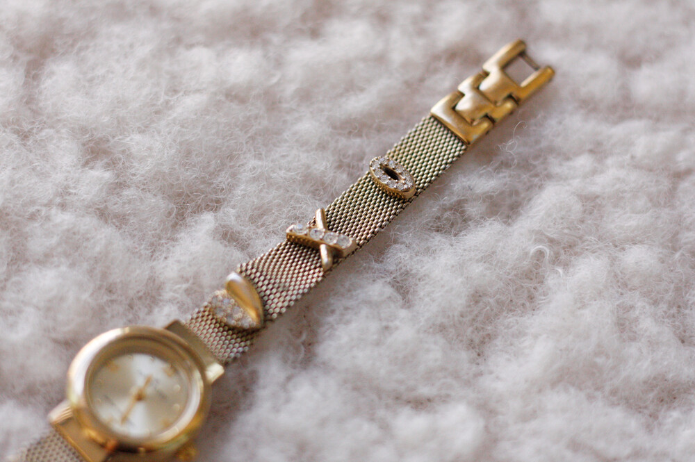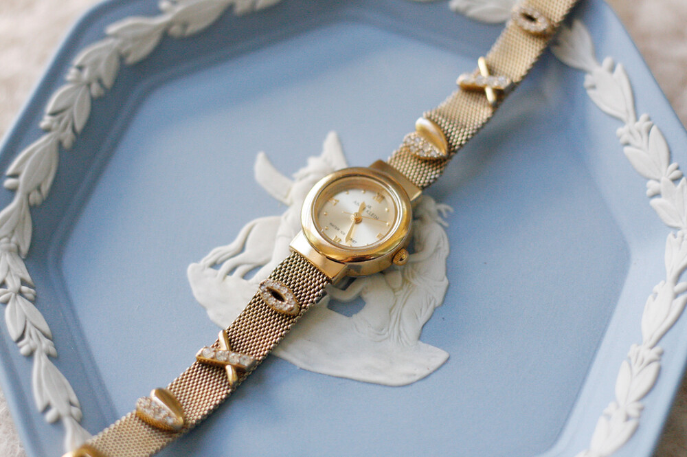 단조로울 수도 있는 일자형 메쉬 밴드 위에 XOXO가 포인트로 올라간 귀여운 디자인의 앤클라인 시계입니다. 메시 위에 올라간 XOXO의 절반은 라인스톤으로 장식되어있으며, 정장보다는 캐주얼에 더 잘 어울리는 제품입니다 :) 약간 톤 다운된 골드톤이라 더 빈티지한 느낌이 강한 시계여요.