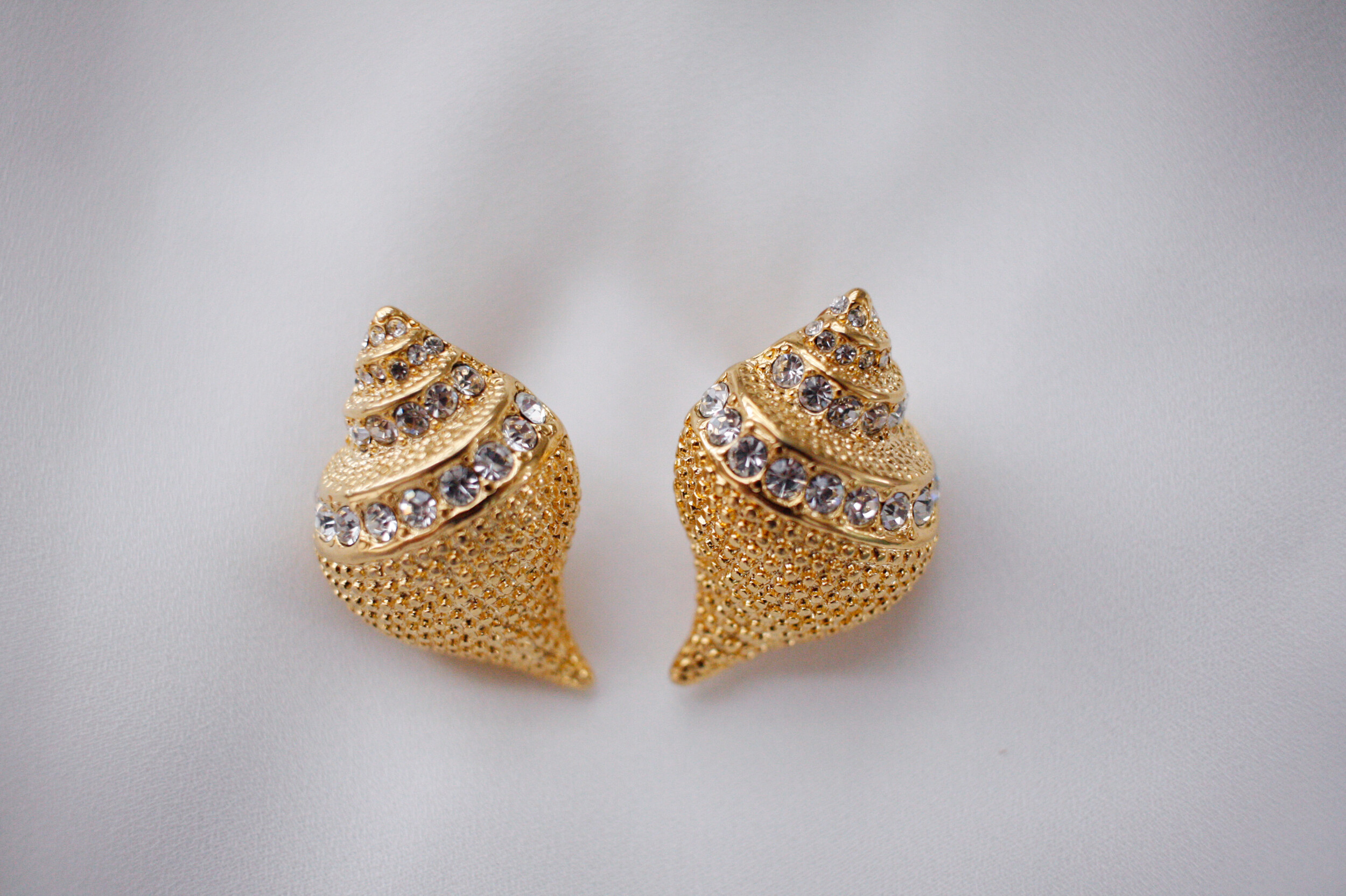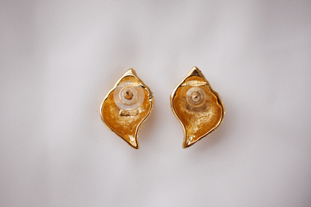 피어스타입의 소라 모양 귀걸이입니다. 크기가 있어 무게감도 있고 화려한 느낌으로 착용할 수 있는 제품입니다. 시국이 시국인지라 연말파티 자리가 거의 없겠지만, 모임룩에 포인트 될만한 아이템이어요 :)